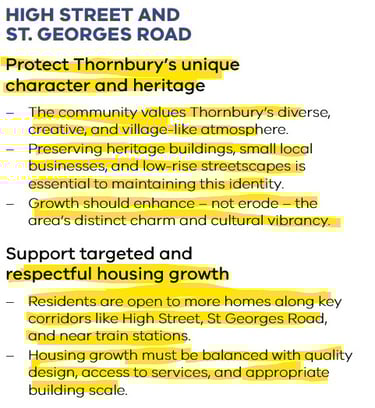 There was no ambiguity in the feedback provided during Phase 1 or through the Community Reference Group (CRG). The message from Thornbury residents was clear and consistent: protect our residential streets, retain High Street’s village-like scale, and direct growth to St Georges Road where it makes sense. Yet despite this unity of voice, the Government’s draft plans ignore every one of these priorities. The consultation process didn’t fail because the community was divided, it failed because the Government chose not to listen.