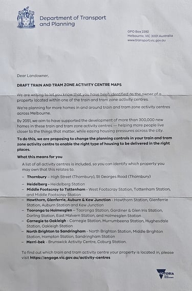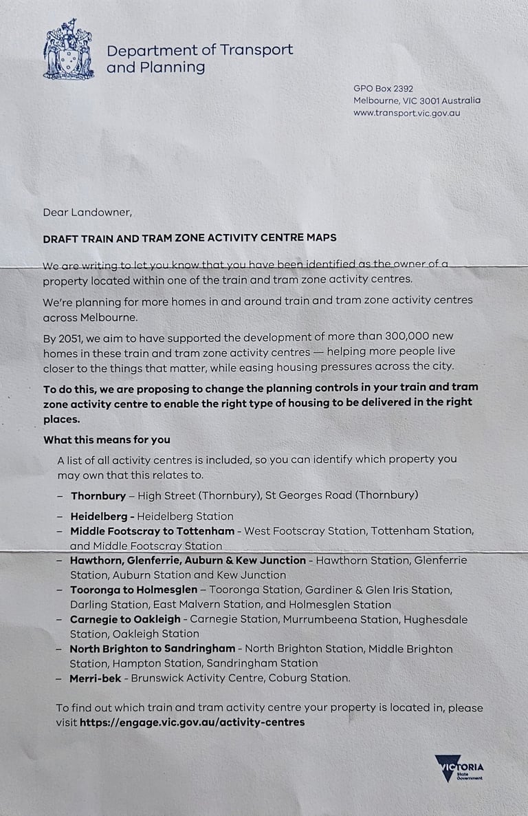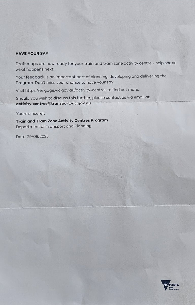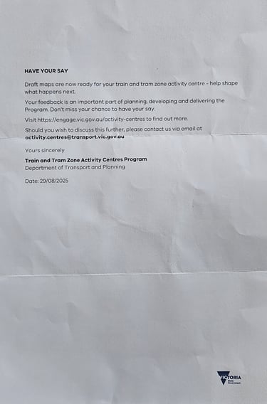 An example of the Government’s so-called “community engagement.” This letter makes no mention of the applicable Activity Centre, no reference to the Activity Centre boundaries, no explanation of the applicable catchments (or any catchments), and no discussion of the impacts residents actually face. It’s a generic, copy-and-paste communication sent across Melbourne — not a genuine attempt to inform or consult the people who live here.